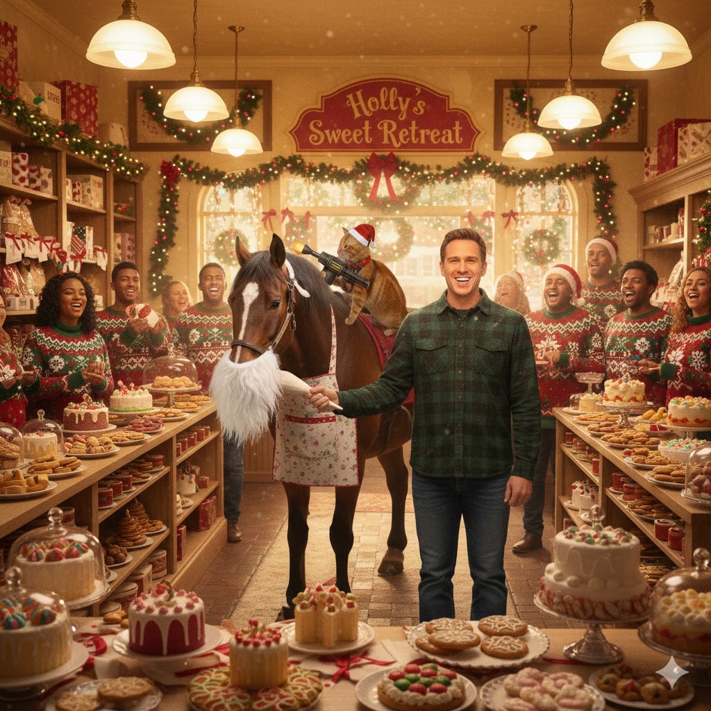 Unbeknownst to Holly, since she left Christmasburg, Nick opened a bakery and named it in memory of their hot and heavy nights in his old Chevy. Of course, Holly’s emotional support horse has to check it out as executive producer KitAI makes his first cameo.